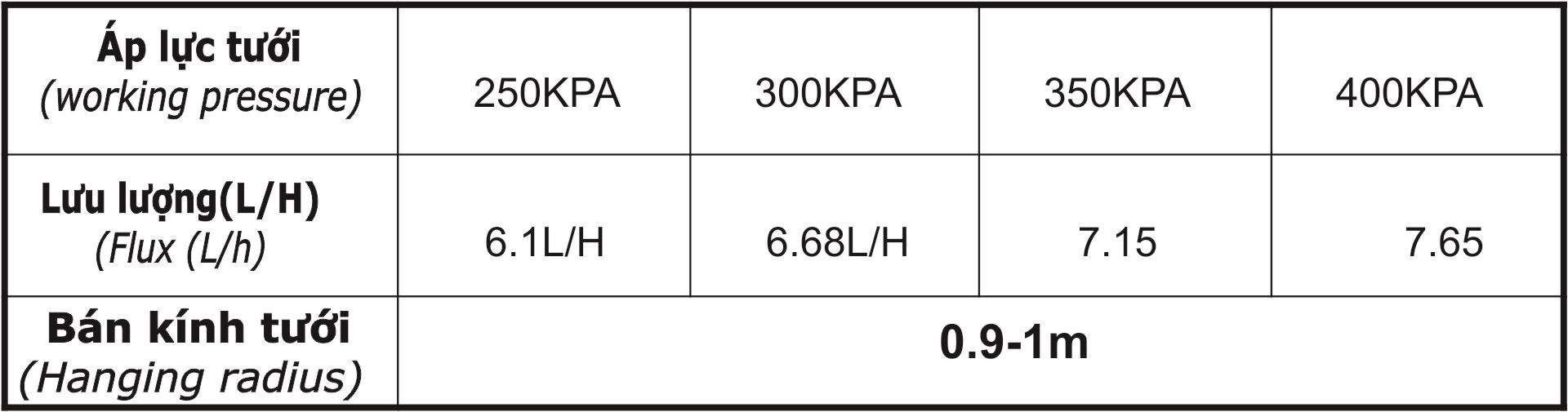 Bảng thông số lưu lượng tưới đầu phun màu xám