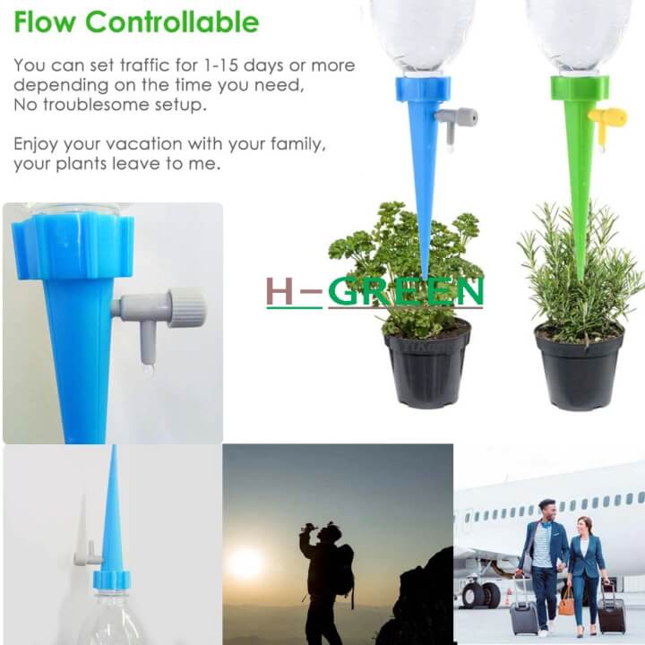 Tự động tưới nhỏ giọt trong vài ngày cho cây, có thể lắp với các loại chai nhỏ như trai lavi (300ml) thông thường có thể sử dụng được trong 1 ngày, với chai to hơn (2L) được 2-3 ngày.