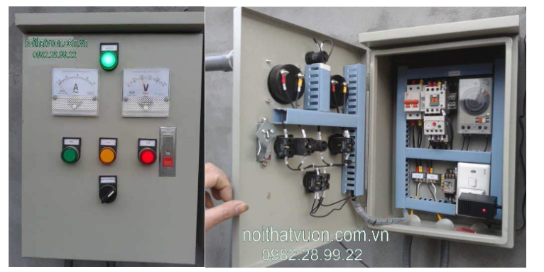 Tủ điện được thiết kế rất gọn nhẹ dễ sử dụng. Người dùng muốn điều khiển bằng tay thì chỉ cần gạt nút mầu đen sang bên trái và thực hiện ấn nút tròn mầu xanh để bật, và ấn nút tròn mầu đỏ để tắt; còn nếu muốn dùng hẹn giờ tưới tự động thì gạt nút mầu đen sang phải, tiến hành cài đặt giờ tưới theo nhu cầu của cây. Việc tưới cây trở nên đơn giản và hiệu quả vô cùng.